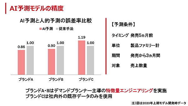 では、精度を上げるためにどのようなことをしているのか? 実際の売上に対して、次図のように、人による売上予測、AIの売上予測の誤差比率を比較してみると、人による予測を1とした場合、ブランドAとBは約10%精度が高くなったが、ブランドCでは約20%劣る結果となった。これは、モデルの生成の違いによるものだ。