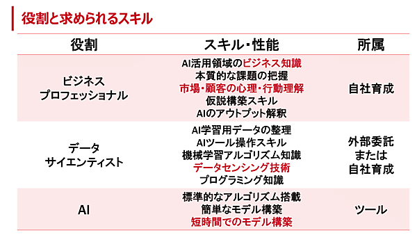 ビジネスプロフェッショナルには、ビジネスドメインの知識、経験、市場や顧客心理に基づく行動予測ができるスキル、さらには、それをもとにAIの精度向上の仮説を立てられるスキルが求められる。自社の事業や顧客の知識が必要なので、自社で育成をしている。