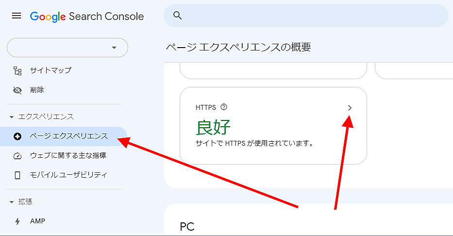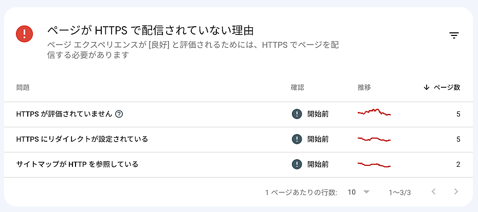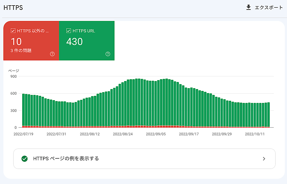 このレポートは、Search Consoleで左側のメニュー[エクスペリエンス]>[HTTPS]から確認できる。