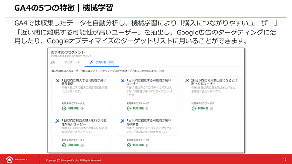 一定の条件を満たすと、データを自動的に機械学習した「おすすめのセグメント」が利用できる。Google 広告のターゲティングや、Google オプティマイズのターゲットリストに利用可能。