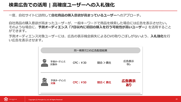 セッションでは、プリンシプルの大出氏がカスタムオーディエンス、予測オーディエンスの活用アイデアをそれぞれ紹介していった。ECサイト担当者であれば、自社のサイトでの活用をイメージしながら読み進めてほしい。