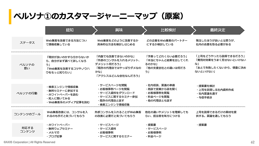 コンテンツのゴールを確認するためには、カスタマージャーニーマップを活用します。