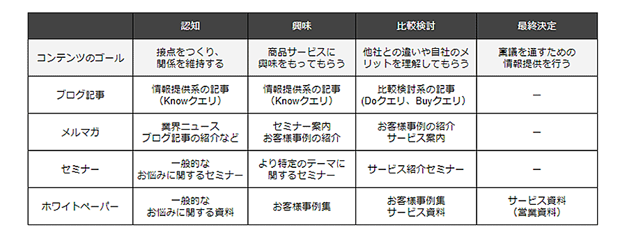 この視点を忘れてしまうと、「頑張っているけど思ったような成果が出ない」なんてことになりかねません。たとえば、アクセスが集まりやすいけど、商談にはすぐ結びつかない認知寄りのコンテンツばかり作ってしまうなどです。成果を出すためにも、常に、何の目的でこのコンテンツを作っているか意識することをお忘れなく。