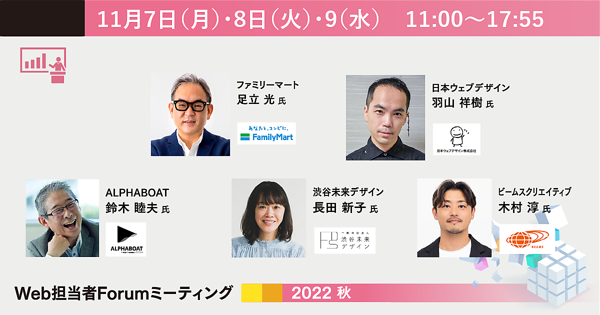 ファミリーマート、JTB、テレ東、ユナイテッドアローズなどが登壇する「Web担当者Forumミーティング 2022 秋」を11月7日(月)~11月9日(水)の3日間で開催します。