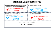 実際のエンタープライズSEOの現場で僕たちは、そうした失敗を数多く見てきた。変更に対する知見はもっているものの、A/Bテストを経ずにサイト全体に変更を加えた結果、オーガニック検索のパフォーマンスが20%も27%も低下したケースだ。
