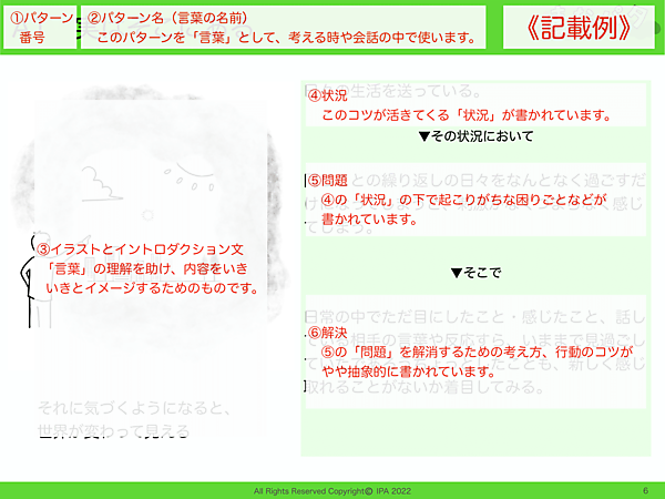各カテゴリから、さらにグループ、パターンと分かれている。次の画像では、各パターンの記載例を紹介している: