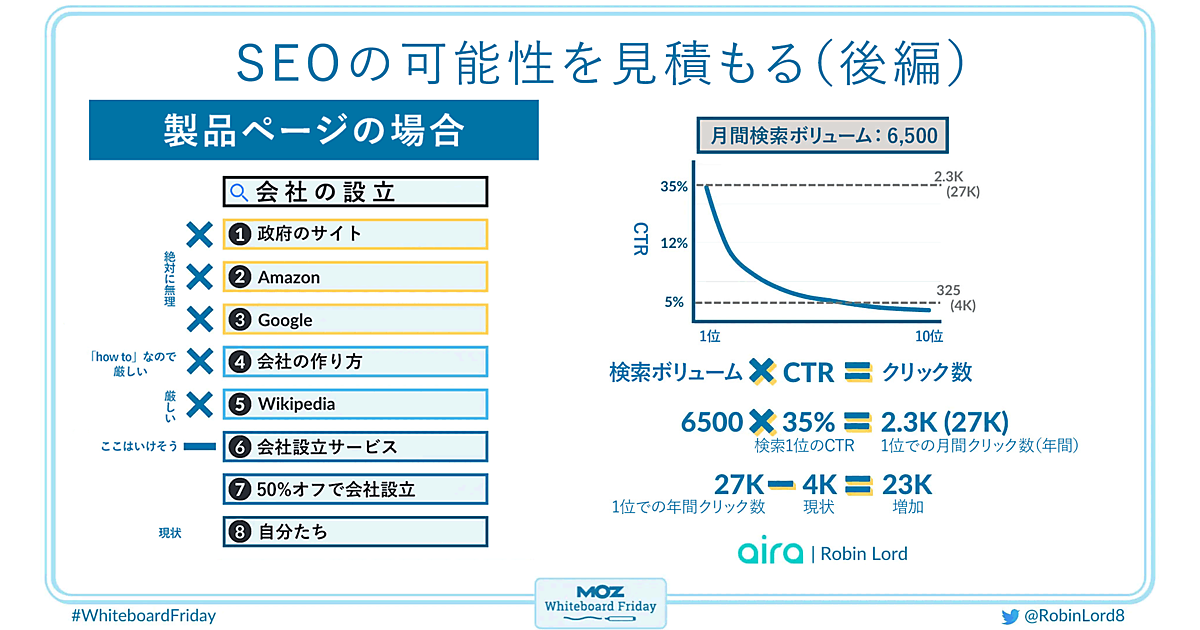 おさらいだが、今回の解説はSEOの成果見積もりでビジネス的に意味のある手法を解説している。例としてあげているターゲットのキーワードは「会社の設立(setting up a business)」だ。