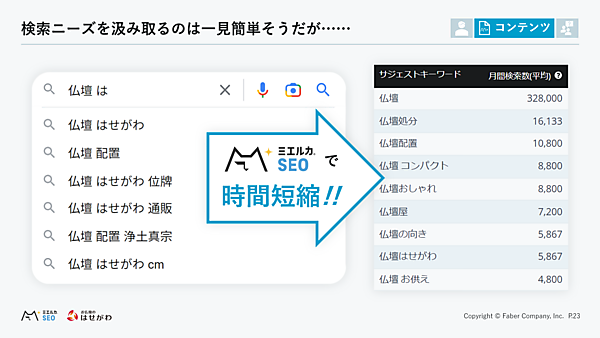 このニーズ調査を手作業で行うのは手間がかかる。はせがわでは、Faber Companyが提供するSEO・コンテンツマーケティング支援ツール「ミエルカSEO」を活用することで、ニーズ調査を効率化し、業務負担の軽減につなげた。ミエルカのニーズ分析機能は、どういうサジェストキーワードがあり、どういう情報が求められているのかをわかりやすい形で“見える化”してくれる。
