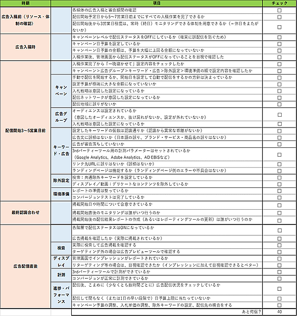 特に1つ目の、「入稿作業完了から『一晩寝かせて』 設定内容をチェックしたか」のプロセスは必ず挟みましょう。広告の配信設定は細かい作業が多く神経を使うため、抜け漏れが発生しやすいです。