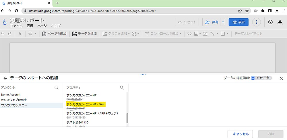 (3)「データへのレポートの追加」で連携したいGA4のプロパティを選択する