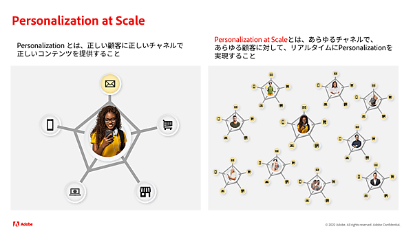 その方法としてあげられるのがパーソナライゼーションだ。講演のタイトルにもある「Personalization at Scale」を日本語に訳すと、「大規模なパーソナライゼーション」となる。従来のパーソナライゼーションでは、企業やブランドが選択したチャネルで、特定のセグメントに対してコンテンツを配信していたが、タッチポイントが広がったことで、顧客が選んだタッチポイントで顧客の都合や好みにあわせてコミュニケーションを行う、一歩先のパーソナライゼーションが求められるようになっている。