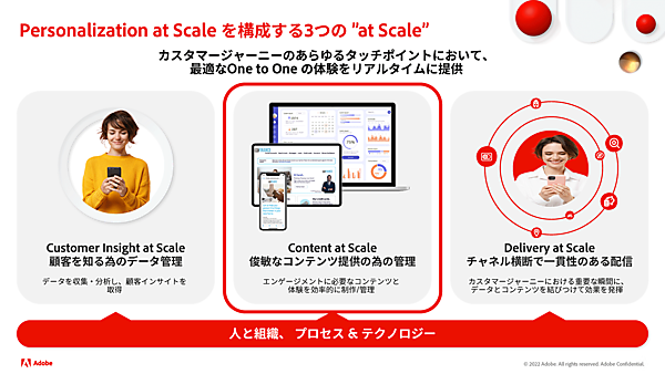 Personalization at Scaleを実現するには、顧客を知るための「データ」、顧客が目にする「コンテンツ」、最適なタイミングでの「配信」の3つの要素が必要になる。今回の講演では「コンテンツ」にフォーカスし、大規模なコンテンツ配信をどう実現するかが解説された。