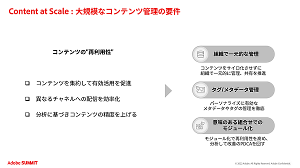 コンテンツの再利用により大規模なコンテンツ需要に対応するには、次の3つが必要となる。
