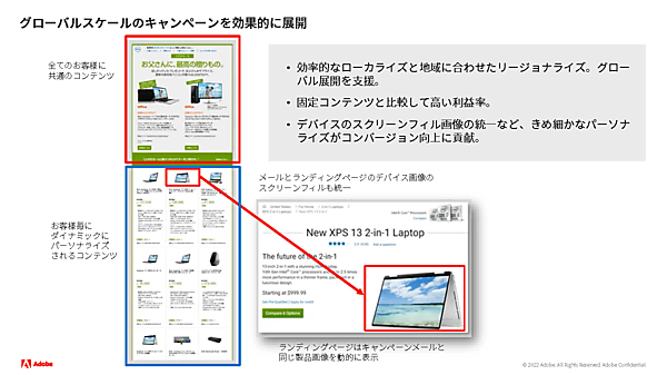 たとえば、グローバルに向けて同じキャンペーンメールを配信するとする。メールの上部(下図の赤枠部分)はグローバルで共通のマスタとして設定されており、リージョンにあわせてローカライズされる。メールの下部(下図の青枠部分)は、リージョンや顧客セグメントにあわせてダイナミックにカスタマイズされる。