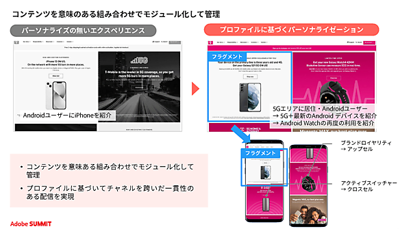 通信企業のT-Mobileでは、以前はコンテンツの管理環境が複雑で、柔軟なパーソナライゼーションができず、AndroidユーザーにiPhoneの最新機種を紹介するなど非効率な配信を行うこともあった。そこで、顧客中心のキャンペーン実施をゴールに部門横断で開発体制を見直し、コンテンツを意味ある組み合わせでモジュール化して管理すると同時に、プロファイルに基づいてチャネルをまたいだ一貫性のある配信を実現できる体制を整えた。
