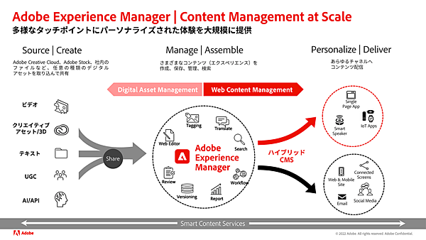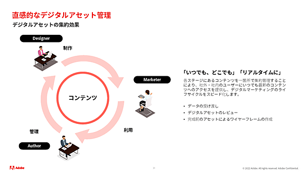 DAMである「Adobe Experience Manager Assets」は、画像、動画、3Dデータ、PDFなどデジタルアセットを集約管理し、関係者はいつでもどこでもリアルタイムで最新データにアクセスできる。