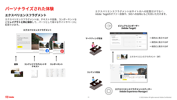 パーソナライズを迅速に行えるエクスペリエンスフラグメント機能では、Adobe Experience Managerに保存したテキスト、画像などのコンポーネントをレイアウトと共に保存して、パーツとしてさまざまなサイトやページにドラッグ&ドロップで配置したり、パーソナライズソリューションの一つであるAdobe Targetと連携して、オファーコンテンツとして配信できる。