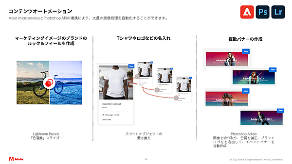 「Asset microservices」と「Photoshop API」の連携でコンテンツの自動処理が可能になるコンテンツオートメーションも提供する。Adobe Experience Managerに画像ファイルをアップロードすれば、Asset microservicesが画像の背景を消す処理を行ったり、同じ画像を複数サイズで生成したりしてくれる。フォルダーごとにさまざまな処理が設定できるため、コンテンツ作成の手間を大幅に削減できる。