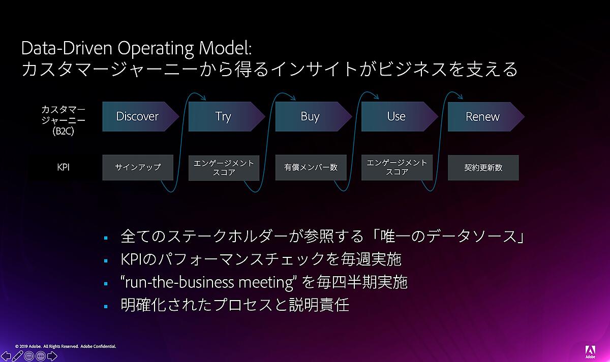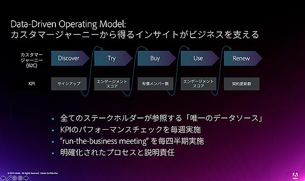 アドビが提唱する「DDOM(Data Driven Operating Model)」というフレームワークに基づいてビジネスの実践と検証をくり返しているうちに、デザインシンキングが身についたのかもしれないと西山氏は言う。