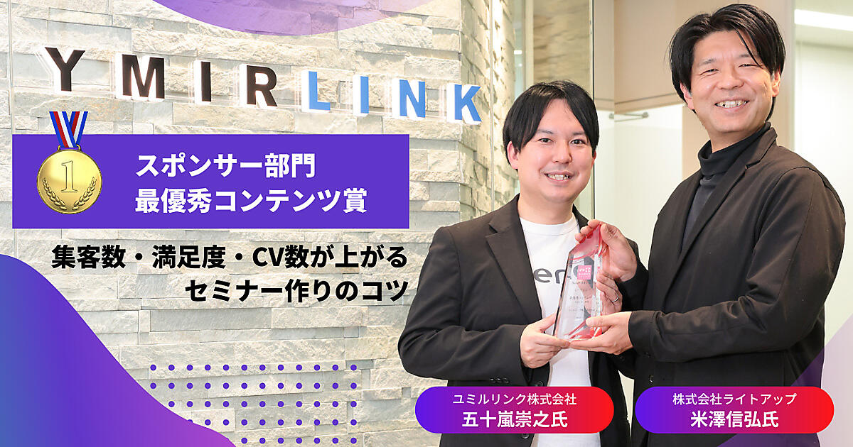 受賞を記念して、「『メルマガを見て購入』するユーザーが4割。ロイヤルカスタマー育成に欠かせない『メルマガ活用』の最新トレンド」に登壇した、ユミルリンク株式会社の五十嵐崇之氏、株式会社ライトアップの米澤信弘氏に、視聴者満足度の高いセミナーコンテンツの作り方についてお話をうかがった。
