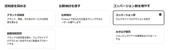 ブランディングから購買まで幅広い活用が可能です。広告配信時にはビジネスの目標に合わせたキャンペーンの目的を選択します。選択した目的種類により、配信手法や広告フォーマットが決まります。課金形式はキャンペーン目的ごとに異なりますが、CPM、CPV、CPC課金の3種類が主な形式です。Pinterest広告のキャンペーンは次の通りです。認知・比較検討・購入促進の分類で構成されています。