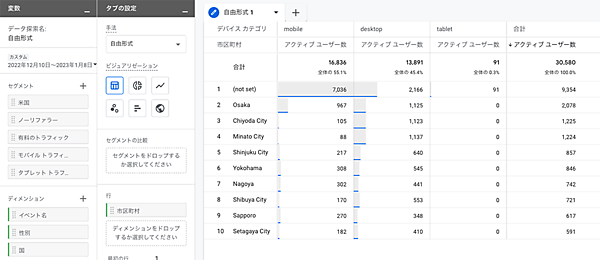 また、UAではセカンダリディメンションを設定できましたが、GA4では「行」にディメンションを2つまで、「列」にディメンションを5つまで設定できるため、行と列にディメンションを複数設定して確認できます。こちらも上手に活用しましょう。