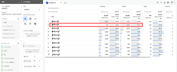 完成したレポートをもとに、先ほど設定した仮説「そもそもAページとBページはモバイルトラフィックのユーザーと相性が悪いのではないか」を検証していきます。