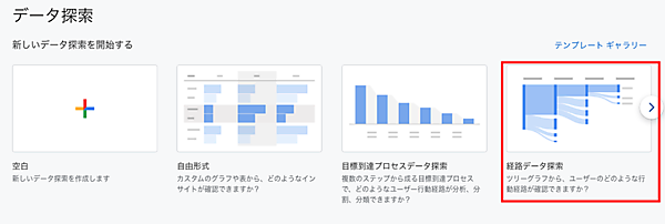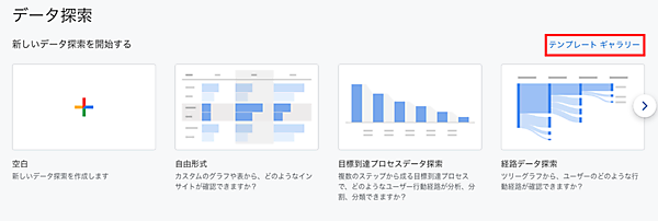 それではレポートを作成して検証を行っていきたいと思います。探索のページの「新しいデータ探索を開始する」の横にある「テンプレートギャラリー」を選択します。