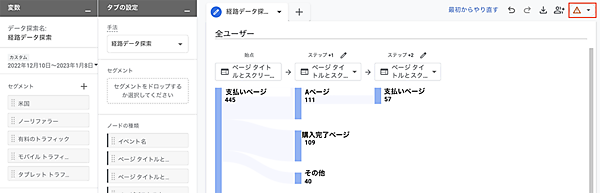 完成したレポートをもとに、先ほど設定した仮説「支払いページで懸念点が発生し先に進まずに別のページに移動しているのではないか」を検証しましょう。
