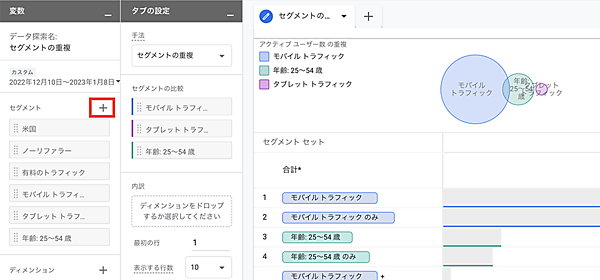 最後に「セグメントの重複」について解説します。セグメントは3つまで作成・選択でき、選択したセグメントの重なり具合を確認できます。
