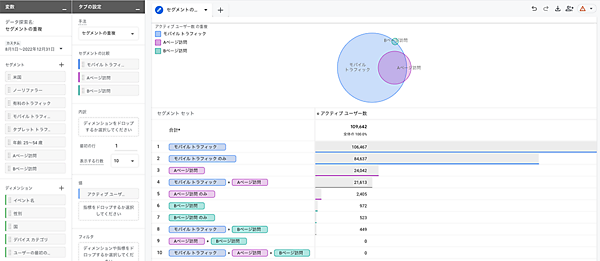 検証:Aページ訪問ユーザー・Bページ訪問ユーザー・モバイルトラフィックユーザーの重複を確認する