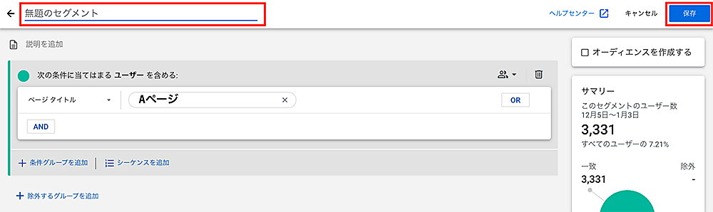 最後に「無題のセグメント」の欄をクリックし、セグメントの名称(Aページ訪問)を入力して「保存」します。