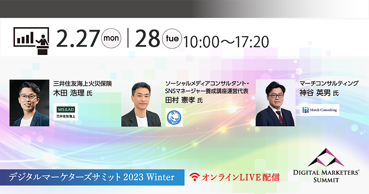 レゴ、貝印、おやつカンパニー、三井住友海上、リクルート、WACULなどが登壇する「デジタルマーケターズサミット 2023 Winter」を2月27・28日(月・火)に開催します。