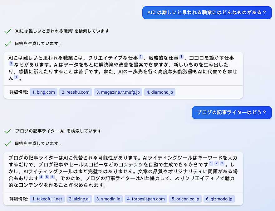 これにより、質問に対して最新の情報を検索して回答に組み込むといったことを実現している。実際にチャットへの回答では、さらに詳しく知るためのURLも併せてリンクとして表示している(前出画像の1つ目の回答で4つのURL、2つ目の回答で6つのURLがリンクになっている)。このあたりは、検索エンジンであるBingの隣接機能らしい作りだ。