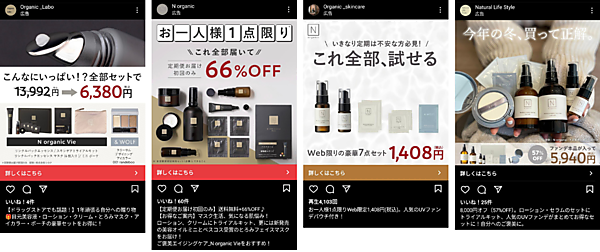 公式アカウントを見る前は「ケアした方がいいんじゃないですか?」とニーズを喚起する広告だったのが、「これ全部届いて66%OFF」「これ全部、試せる」といったお得なセットの広告に変わったのです。