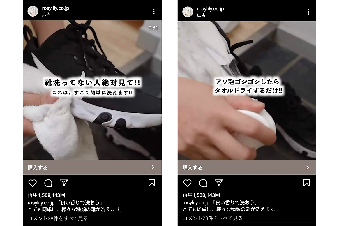 洗ったスニーカーのビフォー・アフターとともに、かんたんさを訴求するコピーに惹かれて、動画広告を最後まで見ました。スタジオ感のない、普通のおうちの玄関で洗っている様子も、リアルさがありました。