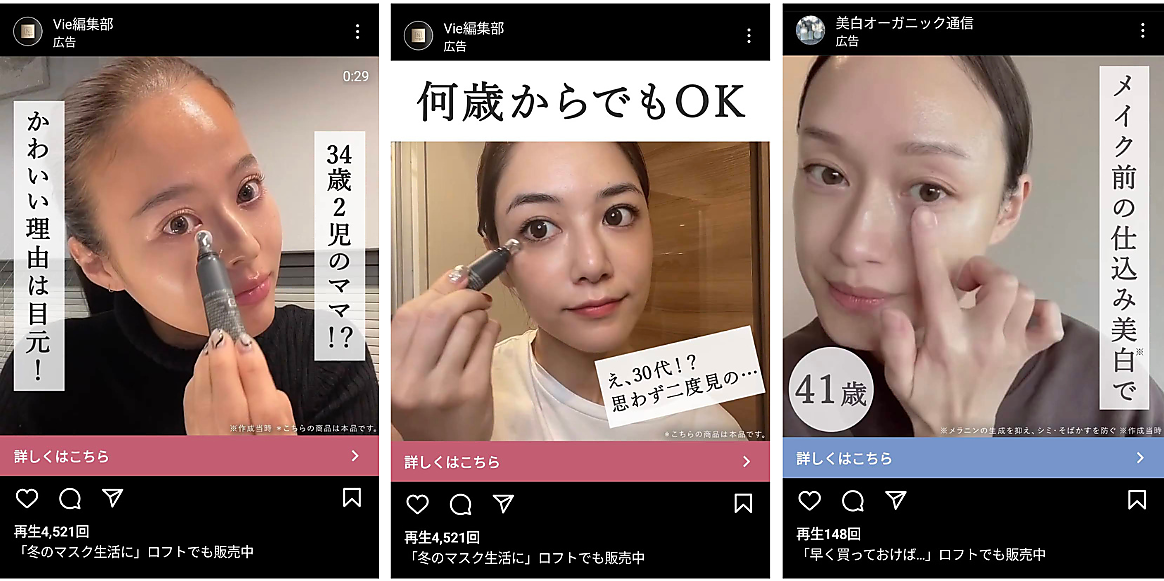 商品はエイジングケアのため、年齢とのギャップをうたうクリエイティブが多め。よくよく見てみると、登場しているのはモデルの方なのですが、「※こちらはモデルの方です」とも書いてないので、最初は一般の人なのかと思ってしまいました。