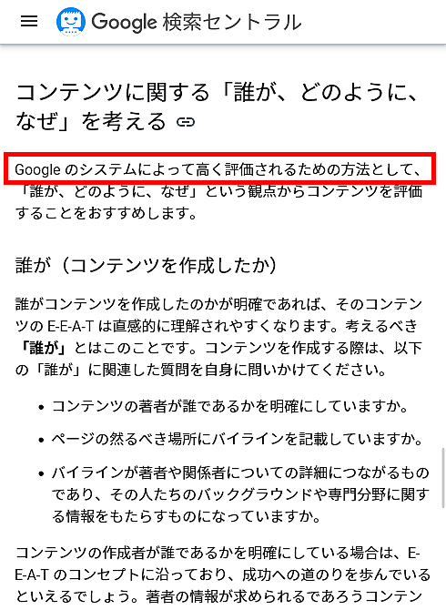 グーグル検索で高く評価されるための方法に、「誰が・どのように・なぜ」という観点からコンテンツを精査することをこのセクションは推奨している。