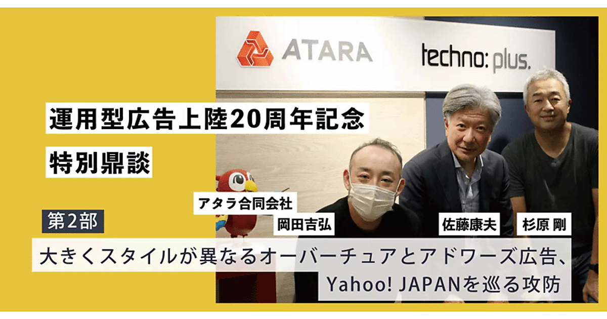今回は、オーバーチュア、Googleの日本市場立ち上げメンバーであり、検索連動型広告市場をけん引してきた佐藤康夫、杉原剛、岡田吉弘による、歴史を振り返りつつ未来の展望を見据える特別鼎談を全3回にわたってお送りします。