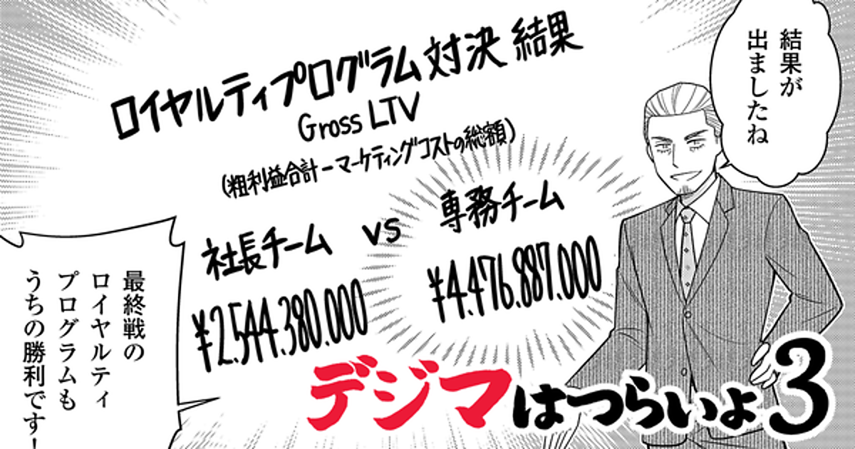 【漫画】デジマはつらいよさらば山形! EC対決で勝利した戦略は、なぜ会社を救えないのか?/【漫画】デジマはつらいよ3・最終話仮想EC対決、最終戦・ロイヤルティプログラム対決の勝敗の行方は……?中澤伸也(原案、監修)、星井博文(原作)、このえまる(作画)、トレンド・プロ(マンガ制作)2023年3月31日 7:00シェアポストはてブBluesky前回までのあらすじ!仮想空間でのEC戦略シミュレーション対決・第3回・CRO対決は山形の率いる社長チームが勝利!勝負は最終戦・ロイヤルティプログラム対決に持ち越された。マーケティング/広告 13,969マンガ/小説 397この記事をシェアしてほしいパン!ポストする>ブクマするnoteで書くLINEで送る