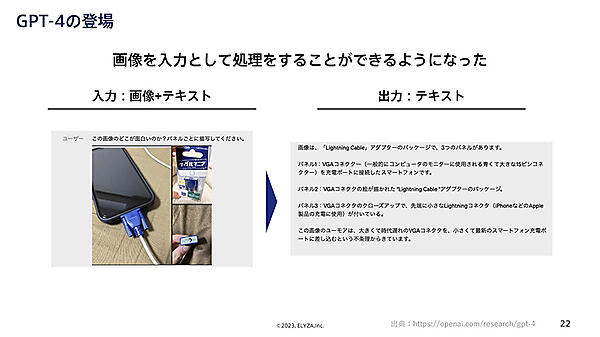 さらに、「GPT-4」はマルチモーダル技術によって、テキストだけでなく画像を入力として処理できるようになったのも大きな変化のひとつだ。つまり、AIが画像の情報を読み取り、テキストで説明を返してくれるのだ。