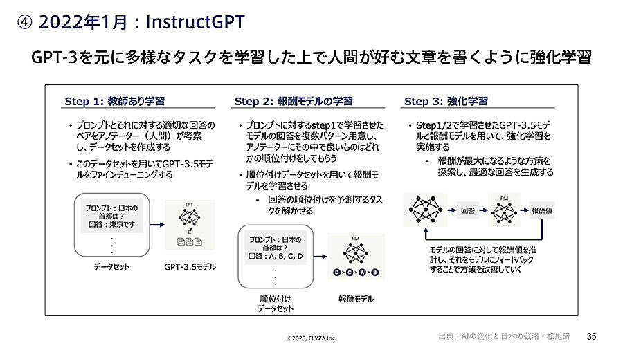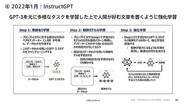 改良合戦の中でキーになったのが『Instruct GPT』です。『GPT-3』を元に多様なタスクを学習して人間が好む文章を書くように強化学習をさせるというもので、出力として望む結果を人の手で作って学習させ、AIから出力された文章にフィードバックをしてサイクルを回すことで精度を上げたのです(曽根岡氏)