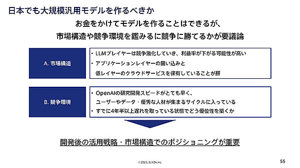 仮に数百億円かけて作ることはできても、その後どういう活用戦略があってどう競争に勝つか、そこを考えなければ意味がありません。現在の市場のコスト構造や競争環境を見ても、OpenAIのようにMicrosoftが年間1000億ドル出資しているようなクラウドプラットフォームで同じ立場で戦えるかというと、そうではない。置かれている市場や競争環境を理解し、どのようにチューニングしていくのか、何を自分たちのドメインとして勝ち目を狙うのか、議論していく必要があるでしょう(曽根岡氏)