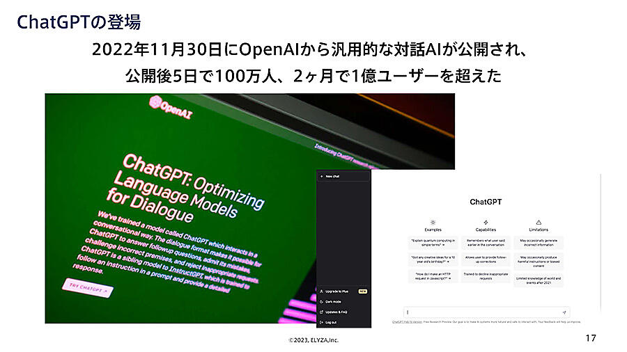 セッションは、AIの現状に関する解説からスタートした。勉強会のきっかけとなった「ChatGPT」は、2022年11月30日にOpenAIから公開された汎用的な対話AIで、高精度で使いやすいUIも影響したのか、公開後5日間で100万人が使用し、2ヶ月で1億ユーザーを超えるなど、大きな注目を集めている。