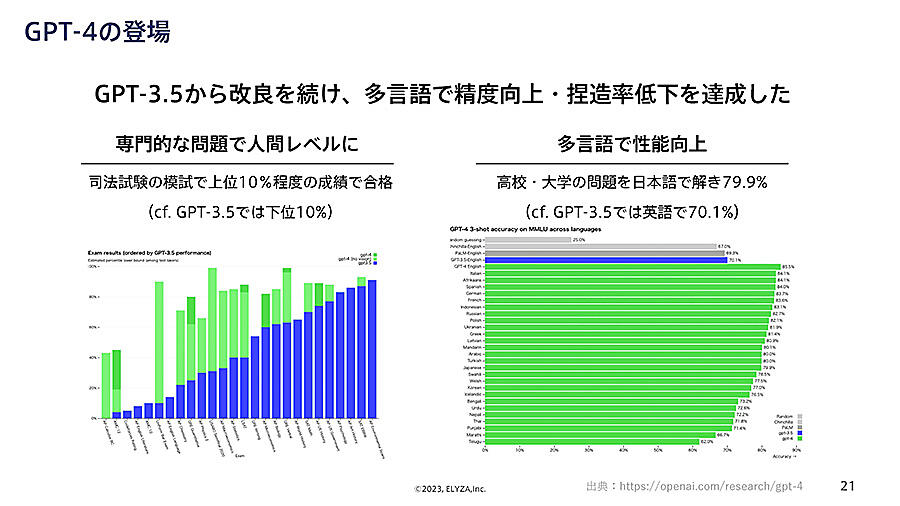 なお、「ChatGPT」は現在も進化しており、従来の「GPT-3.5」から改良を続け、多言語で精度向上、捏造率を低下させた「GPT-4」が3月14日に新しく発表された。