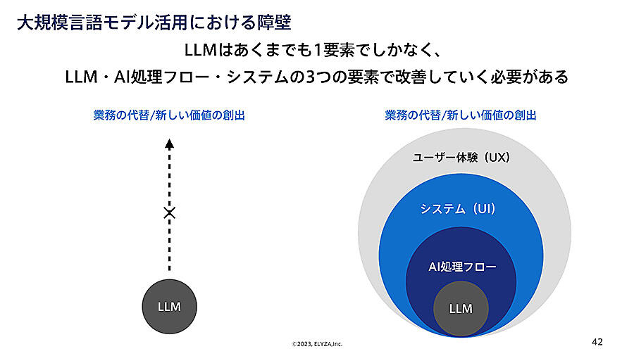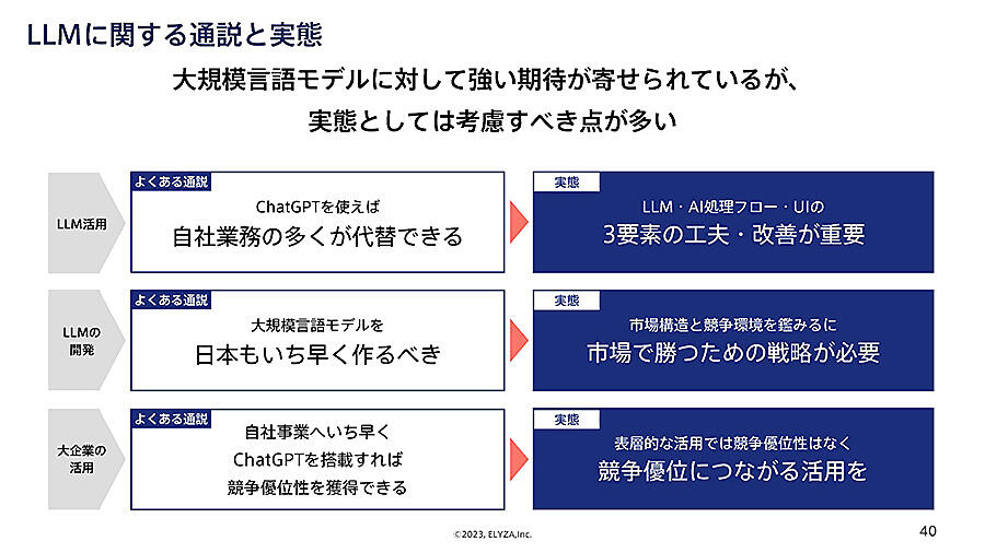 それぞれについて、ELYZAによる見解を紹介しよう。まず1つ目に「ChatGPTを使えば自社業務の多くが代替できる」という通説だ。これに対し曽根岡氏は「ただ導入すればいいだけではなく、周辺領域の設計が必要なため、大規模言語モデル・AI処理フロー・UIの3要素の工夫と改善が重要だ」と話す。