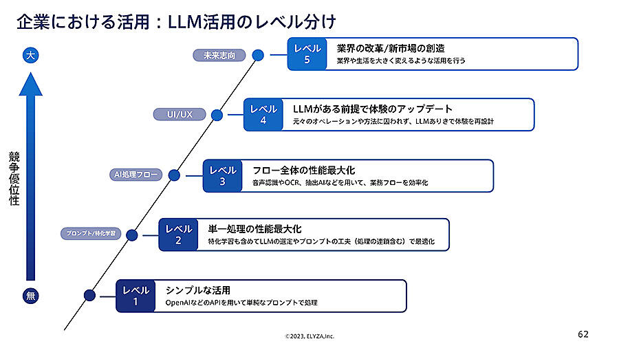 最後は「自社事業へいち早くChatGPTを搭載すれば競争優位性を獲得できる」という通説についてだ。まず前提として、LLMの活用は以下のようなレベルがある。