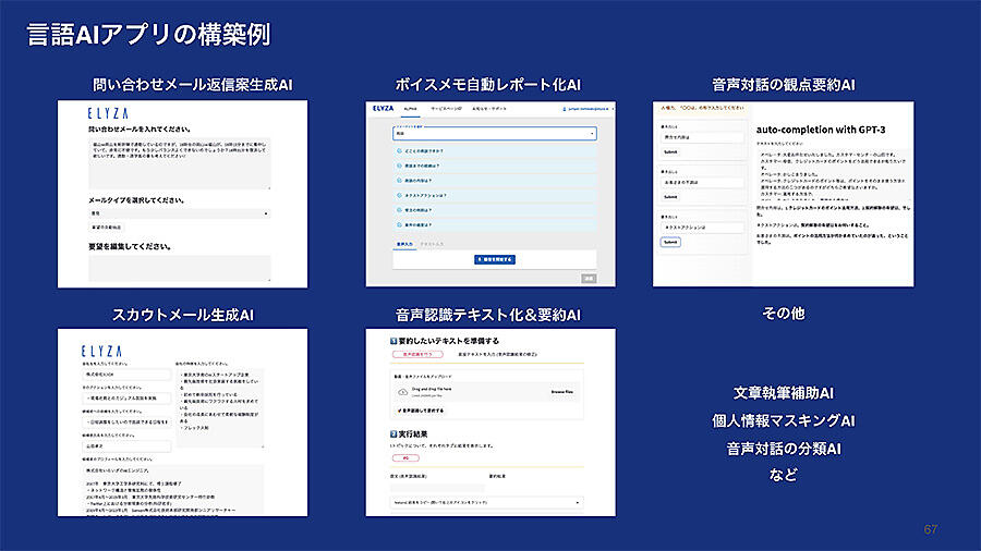 活用の検討から最短1週間でAI処理フローとUIのセットが構築でき、さまざまな言語AIの使い分けができるようになるという。大企業での利用を前提としたセキュリティ環境も構築でき、実際の例として「問い合わせメール返信案生成AI」「ボイスメモ自動レポート化AI」などといったものが挙げられた。