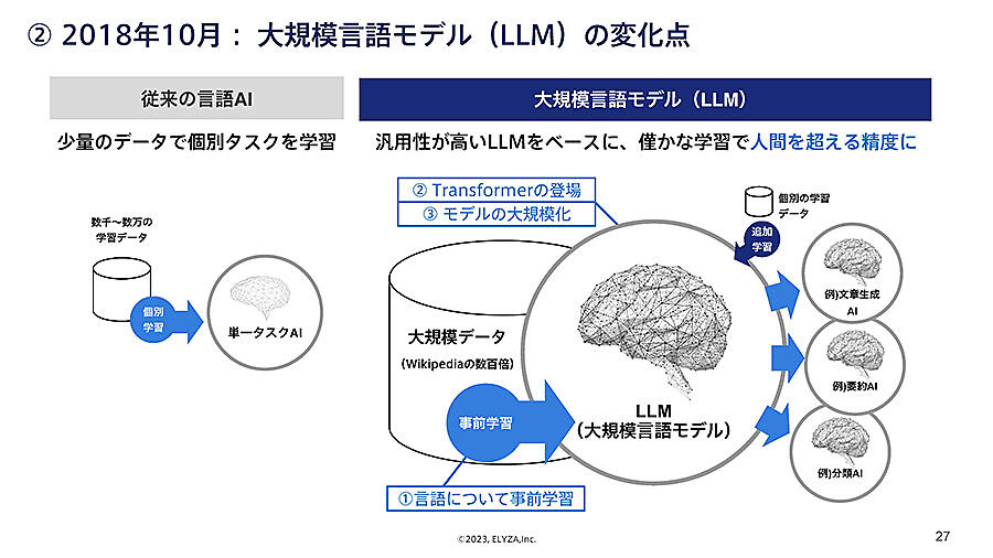 そもそも、大規模言語モデルが登場する2018年以前は、「AIに言語を扱わせるのは厳しいだろう」と言われていた。それは、従来の言語AIは少量のデータで個別タスクを学習させており、「知らない言語の大学入試問題をいきなり渡される」ような状態だったからだ。しかし、2018年10月大規模言語モデル(LLM)が登場した結果、数万件の教師データを集めて言語について事前学習させて、汎用性が高いLLMをベースにすれば、わずかな学習で言語AIは人間並みの精度に到達することがわかった。