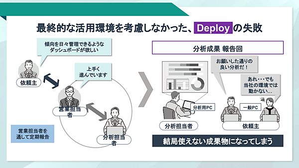 PCのスペック不足が原因で、分析データがスムーズに動かないこともある。分析者が使うPCはハイスペックであることが多いが、分析の依頼者のPCスペックにはばらつきがあり、環境によっては動かない場合もあるので、最終的に「誰が・どのように・利用するのか」をヒアリングしないと、結局使えない成果物になってしまう。